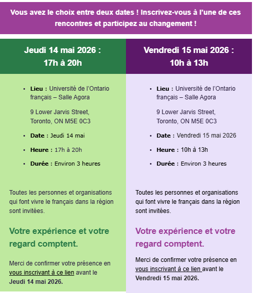 Dans le cadre de l’Acte 2 des États généraux de l’Ontario français, nous vous invitons à participer à une rencontre régionale de co‑construction. Un espace ouvert pour se projeter vers la suite et imaginer ensemble des pistes concrètes pour l’avenir de notre communauté.